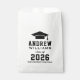 Modern graduation party favour bags feature a grad cap with simple and black typography design that can be personalised with the graduate's name and school. Black text can be customised to match school or party theme colours.