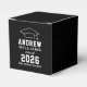 Modern graduation party favour boxes feature a grad cap with simple and white typography design that can be personalised with the graduate's name and school. Black background can be customised to match any school or party theme colour.