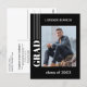 Unique and trendy minimalist style congratulations graduate announcement and celebration party invitation card, framed with a stylish white abstract stripes border pattern on a black background. With room to customize or personalize with a photo, the name of the graduate, class graduation year, high school, future college or university name, and celebration party event information. Let the family, friends, and neighbors know there is a happy graduate ready to conquer the world, and invite everybody to come to celebrate the happy event with you!