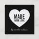 Modern minimalist business card with the word "Made with Love" in bold font in black against a white heart and a stylish script for your name or store name in white. This versatile business card also works well as a gift tag, favour tag or product tag.