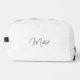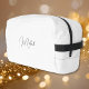 Create your own custom, personalised, beautiful modern elegant black script / typography monogram monogrammed, durable Polyester Poplin, sturdy polyester fabric mens womens kids solid plain white cosmetic makeup toiletry organiser golf beach accessory gym travel dopp kit bag pouch with a zippered closure, two interior mesh pockets - one zippered and one elastic, and a convenient carry-handle that doubles as a hanging strap. Simply type in your name / initials / monogram, to customise. Make a great gift for birthday, fathers day, mothers day, christmas, holidays, new years, wedding, marriage anniversary, and more, for your loved ones, mum, dad, husband, wife, bride, groom, bridesmaid, groomsmen, son, daughter, sister, brother, grandpa, grandma, grandparents, grandkids, kids, family and friends.