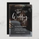 These modern, elegant wedding invitations feature your own personal photo covering the background completely. A sheer black overlay contains white trendy script typography, and the back of the card is black. A glam, stylish look your guests will love!