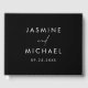 Simple, elegant wedding guest book featuring the couple's names and date displayed in white lettering with the date shown below against a black background. Personalise the spine of the guest book with your names, the date, etc. The back of the modern guest book displays your horizontal engagement photo. The chic black and white wedding guest book is perfect for modern weddings.