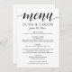 Modern and chic black and white wedding menu cards feature a stylish black typographic design with bold calligraphy script accents and elegant custom text that can be personalised with your delicious dinner menu details and a monogram of the bride and groom names and wedding date.