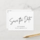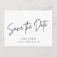 Custom-designed wedding save the date postcard featuring modern black and white hand lettering design.