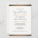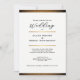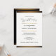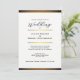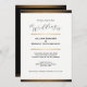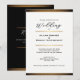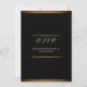 A Modern Minimalist Black and White With Gold Wedding Invitation trimmed in black borders on a white background with gold accents. The front side text includes: Wedding Invitation, Together With Their Families, The Bride and Groom's Names, Request The Honour of Your Presence at their Wedding, Wedding Date and Time, Location and Address, with Reception Note. The reverse text include: RSVP and your Reply Details on a black background with gold accent. To personalise simply insert your text into our easy template, replacing the sample.