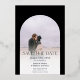 Modern boho arch 4 photos wedding real gold foil and black save the date. A cool simple and minimalist layout with a bohemian desert vibe. Perfect for casual outdoors weddings.