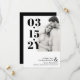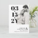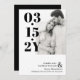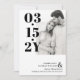 Modern typography save the date with your wedding date written in large bold black numbers next to a photo of you and your future spouse. Add names and additional information in elegant fonts. A clean minimalist save the date flat card.
