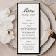 This wedding menu features “Menu” displayed in elegant black calligraphy script with the couple’s names, wedding date, and menu selections arranged below in refined serif lettering. A bold black border frames the design, creating a clean and structured presentation that feels timeless and sophisticated. The balanced layout offers a polished way to showcase your reception courses, making this menu card ideal for modern, classic, and formal wedding celebrations. Personalize the text to create a cohesive table detail that complements an elegant wedding setting.