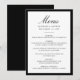 This modern wedding menu features “Menu” in elegant black calligraphy, paired with refined serif lettering for the couple’s names, wedding date, and reception courses. A bold black border frames the layout, creating a clean and structured look that feels timeless and polished. The classic typography and strong contrast offer a sophisticated presentation for your dining selections, making this menu a beautiful addition to formal, modern, and traditional wedding table settings.