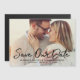 Announce your wedding date to family and friends! This modern wedding save the date announcement magnet design features a horizontal photo of the engaged couple on the front with a white brushed "Save our Date" calligraphy script overlay and a monogram of bride and groom names and wedding date that can be personalised. Note, the white text colour can be modified.