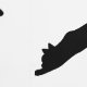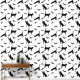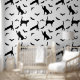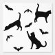 Simple black silhouette pattern of cat and bat silhouettes. One cat is stretching, another is just standing while a third one is reaching towards a flying bat. This design has a modern Halloween aesthetic for those who enjoy a minimal and stylish seasonal look.