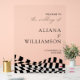 Elegant wedding welcome acrylic sign featuring "the wedding of" in a modern black calligraphy script with a clear background (or colour of your choice) and black chequered pattern giving a vintage,groovy and old money vibe. Personalise the black and white wedding sign by adding your names, wedding date, and wedding location. The vertical acrylic welcome sign is designed to coordinate with our Modern Elegance wedding collection and is available in other colours/style options.