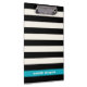 Chic clipboard features wide black and cream stripes with a summery turquoise aqua accent and your name or choice of text in a retro-style typeface.