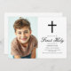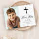 Announce your child's special day with this Modern Black Cross Minimalist Boys First Communion Invitation. The design features sleek black Christian cross on a clean white background. Your child’s photo is placed beside the event details, creating a modern and elegant layout. Ideal for boys or girls, this invitation is easy to personalise.