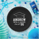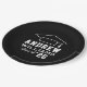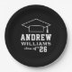 Custom round graduation paper plates features a classic black and white typography design (can be modified via "Customise It!") with a graduation cap and custom text for the grad's name and class year.