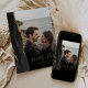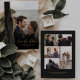 The left-hand edge of this elegant modern wedding save the date card features a black watercolor agate border trimmed with faux gold glitter. The customisable text overlay combines gold-coloured handwriting script and copperplate fonts over your photograph. A black gradient filter helps make the text pop. The reverse side provides spaces for five additional photos (one square, three horizontal and one vertical), along with your wedding website URL or other message in gold-coloured text on an off-black background. Easily replace the sample images with your own photos.