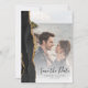 The left-hand edge of this elegant modern wedding save the date card features a black watercolor agate border trimmed with faux gold glitter. The customisable text overlay combines black handwriting script and copperplate fonts over your photograph. The reverse side provides spaces for five additional photos (one square, three horizontal and one vertical), along with your wedding website URL or other message in gold-coloured text on an off-black background. Easily replace the sample images with your own photos.