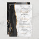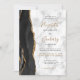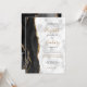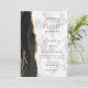 The left-hand edge of this elegant modern wedding invitation features a black watercolor agate border trimmed with faux gold glitter. The customisable text combines black and gold-coloured handwriting, copperplate and italic fonts on a grey and white marble background. The reverse side features a matching black and gold agate design.