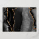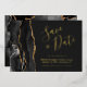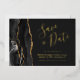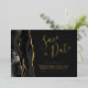 This elegant modern save the date card features a black watercolor agate border trimmed with faux gold glitter. The customisable text combines real gold foil handwriting script, copperplate and italic fonts on an off-black background. The reverse side features a matching black and gold agate design.