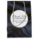Thank you gift bag with a beautiful image of dark abstract agate stone. Colours swirl in waves. Main colours are black, blue-grey with a faux-gold ribbon running through the design. Modern and trendy.