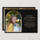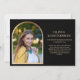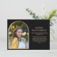 Elegant and modern black and gold custom graduation announcement for the Class of 2025 (or any year). This card is designed on both front and back. The front of the card has an arch-shaped photo, graduate's name, school name, graduation year, and details of accomplishments and/or plans for the future. The back of the card allows you to add 2 more photos framed in gold.