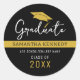 Celebrate your graduate in style with this modern black and gold graduation sticker, featuring an elegant script "Graduate," a sleek graduation cap illustration, and customisable text for the graduate's name, school, and class year. Perfect for sealing invitations, decorating favours, or adding a personalised touch to party decor. A chic and timeless design for any high school or college graduation celebration.