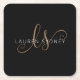 Modern Black Gold Feminine Script Monogrammed Square Paper Coaster