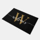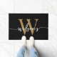 Girly Modern Elegant Stylish Black and Gold Monogram Initial Family Name Script Custom Personalised Doormat. This design featuring a family name in a pretty hand lettered swash tail font calligraphy (or typography) with monogram initial in gold and white on black. Great stylish feminine housewarming gift, also for birthday, wedding, bridal shower, anniversary, bachelorette party and It’s for the girl wholikes clean minimalist things.