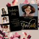 Commend that exceptional graduate with a striking, distinctive, and contemporary design. The term "graduate" is elegantly scripted in genuine gold at the base of the template, set against a black backdrop, leaving room for your graduate's name, date, and one photograph. On the flip side of the card, there's room for three additional photos and your party particulars. Personalise this layout with your own distinct details to craft a magnificent party invitation.