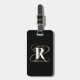 This stylish modern elegant monogrammed luggage tag features a gold script initial with a bold white initial and name superimposed, on a black background.