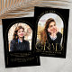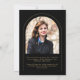 This black and gold simple minimalist arch graduation announcement features a delicate arch frame, 2 photo templates and elegant modern typography.