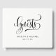 Modern wedding guest book for "Guests" features a modern black and white colour scheme with beautiful handwritten calligraphy script typography. Personalise the casual yet elegant custom monogram text for your wedding day.