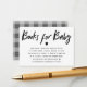Modern book request insert for your gender neutral baby shower. The text on top says "books for baby " in a modern font with explanation of how you'd like the guests to bring a book for your baby instead of a card. The back of the card is grey gingham.