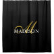 An elegant gold and white monogram on a rich black shower curtain. For your modern unique bath decor.