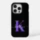 This simple, elegant black iPhone 15 Pro Case with your first name in a trendy script font in white typed over your first initial in a modern cap font in purple would look fabulous on your cell phone and will keep it protected from breakage. It's stylish and trendy and yet very classic.