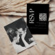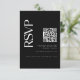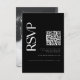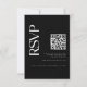 A modern, black wedding RSVP card, designed with a QR code for your guests to scan and access your wedding website, and a customisable photo section on the back. Feel free to change background colour, text colours, etc., by clicking on "personalise this design," then "edit using design tool."