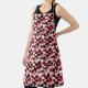 This modern apron features a dark geometric pattern with black, red, grey, and white triangles and rectangles.