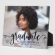 Stylish and elegant graduation plaque sign with easel features a senior photo with "graduate" black script overlay. Personalise the modern custom text with your grad's name, school, and class year. Makes a beautiful keepsake to display in your home!