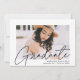 Invite guests to celebrate the graduation with our modern photo graduation party invites. The trendy graduation party invites feature the graduate's photo with "Graduate" in a black modern calligraphy script overlay. Personalize the front of the invites by adding the graduate's name, school name, and graduation year. The invite reverses to display your graduation party details and a trendy black and white dotted geometric pattern.