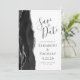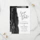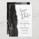 The left-hand edge of this elegant modern wedding save the date card features a black watercolor agate border trimmed with faux silver glitter. The customisable text combines charcoal grey handwriting, copperplate and italic fonts on a white background. The reverse side features a matching black and silver agate design.