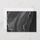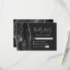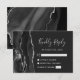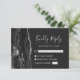 The left-hand edge of this elegant modern wedding RSVP enclosure card features a black watercolor agate border trimmed with faux silver glitter. The title "Kindly Reply" appears in handwriting script, with customizable text below in silver gray copperplate font on an off-black background. The reverse side features a matching black and silver agate design.