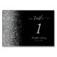 The left-hand edge of this elegant modern wedding table number features a silver faux glitter design. The customisable text combines silver grey handwriting, copperplate and italic fonts on a black background.