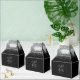 This elegant modern wedding favour box features a silver faux glitter top border. The customisable text, repeated on the front and back, combines silver grey handwriting and copperplate fonts over a large ampersand on a black background.