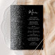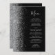 The left-hand edge of this elegant modern wedding menu features a faux silver glitter border. The customisable text combines silver grey whimsical handwriting script and copperplate fonts on a black background. The reverse side features a matching black and silver glitter design.