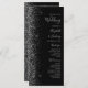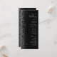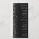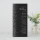 The left-hand edge of this elegant modern wedding program features a silver faux glitter design. The customisable text combines silver grey handwriting, copperplate and italic fonts on a black background.