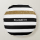 Personalise this modern wide horizontal black and white stripes pattern round throw pillow with a glitzy gold glitter-like stripe by adding the name of any girly girl. This trendy graphic striped pattern is perfect for the chic fashionista. Flat printed image, NOT actual glitter.