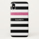 Personalise this modern wide horizontal black and white stripes pattern Barely There iPhone X Case with a hot pink glitter stripe by adding the name of any girly girl. This trendy graphic striped pattern is perfect for the chic fashionista. Flat printed image, NOT actual glitter.