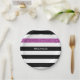 Personalise these modern wide horizontal black and white stripes pattern paper plates with a glitzy purple glitter-like stripe by adding the name of any girly girl. This trendy graphic striped pattern is perfect for the chic fashionista. Flat printed image, NOT actual glitter.