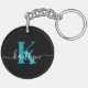 This modern black keychain with your first name in a trendy script font in white and your first initial in a modern cap font in teal is perfect for your keys. It's stylish and modern and yet very classic.